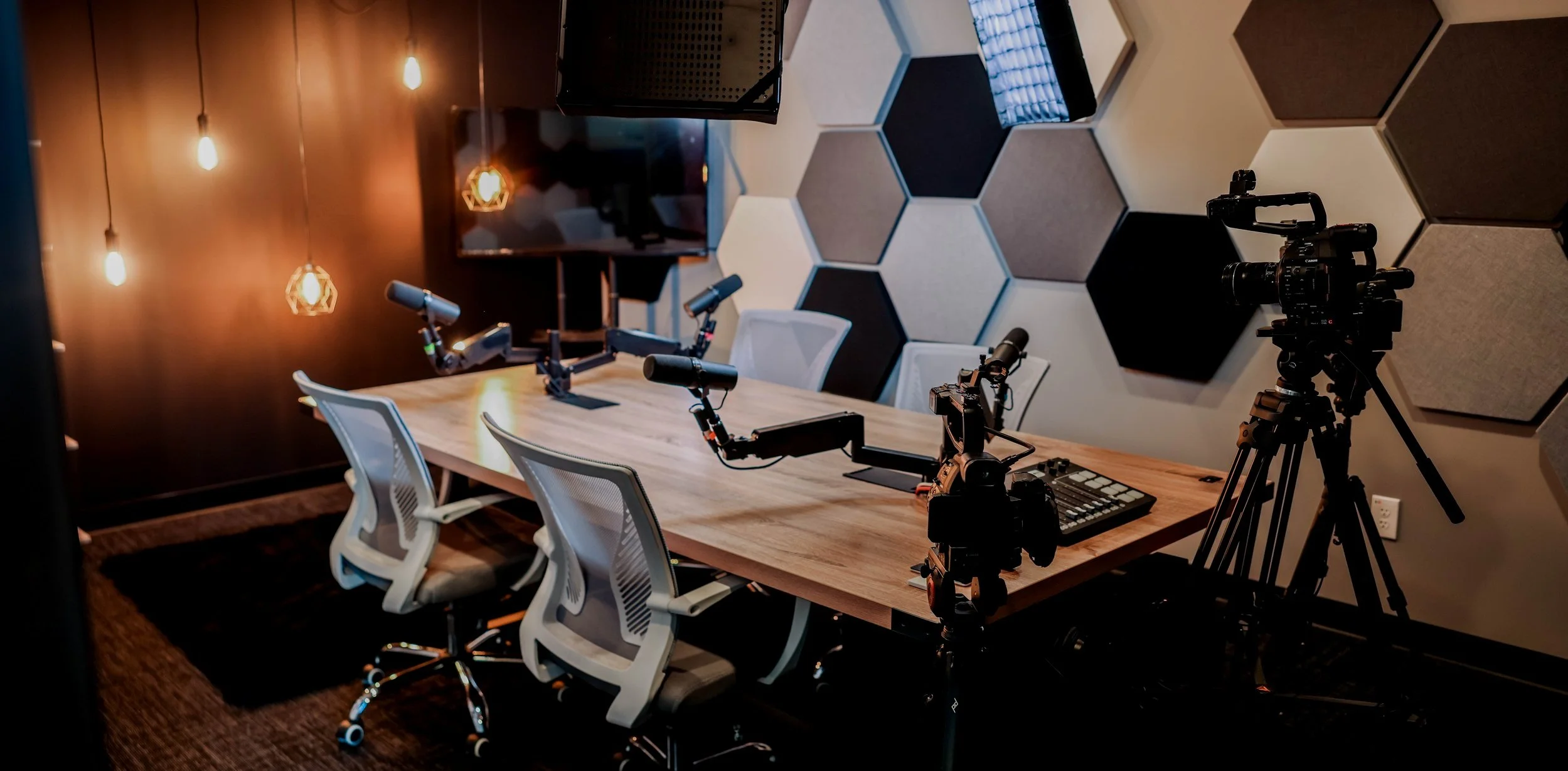 Outfitted with premium microphones, cameras, and lighting, our podcast studio ensures an exceptional recording experience in a creative, acoustically treated setting.